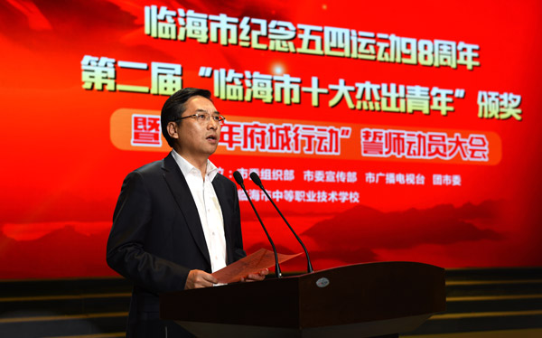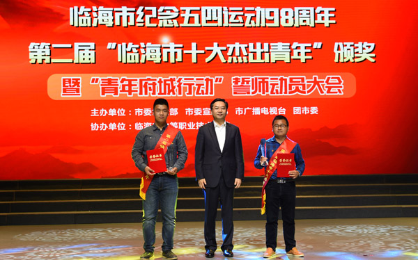 5月4日上午,我市隆重举行纪念“五四”运动98周年、第二届“临海市十大杰出青年”颁奖暨“青年府城行动”誓师动员大会。蔡永波、陈刚敏、邱蓉、董金喜、李本浪、罗秀锋、郭燕飞等市领导出席活动。