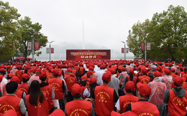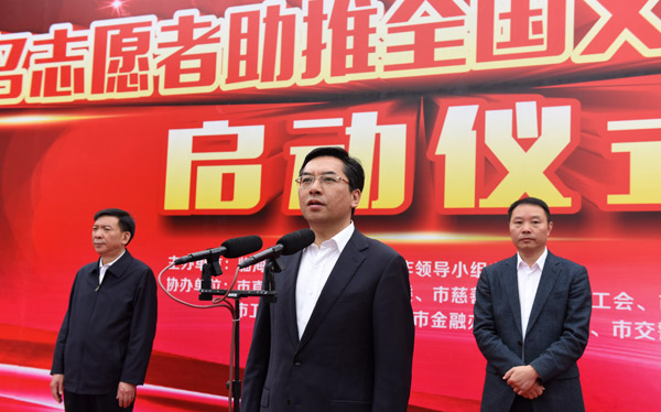 台州市委常委、临海市委书记蔡永波宣布千名志愿者助推全国文明城市创建活动启动。