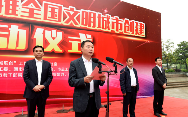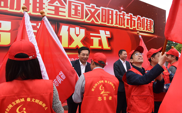 5月4日上午,我市举行千名志愿者助推全国文明城市创建活动启动仪式,动员和凝聚更多的社会力量参与到志愿服务中来,弘扬志愿服务精神,不断提升城市文明程度,助力全国文明城市创建。蔡永波、梅式苗、朱坚国、张招金、董金喜、蔡建军等市领导出席活动。市委副书记陈刚敏主持启动仪式。
