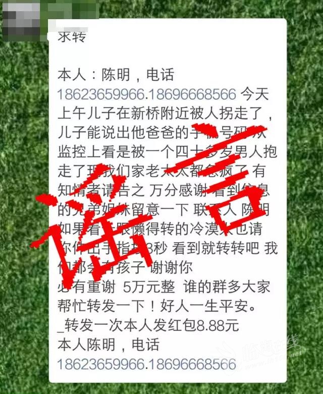近日,一条“陈明的儿子在新桥附近被拐”的信息在很多台州人的微信群里转发,但是细看该信息的内容,却让人怀疑信息的真实性。经过查证这又是谣言,而且曾在多个城市频现,然而各地警方均未接到有家长丢失孩子的报案和类似警情。
