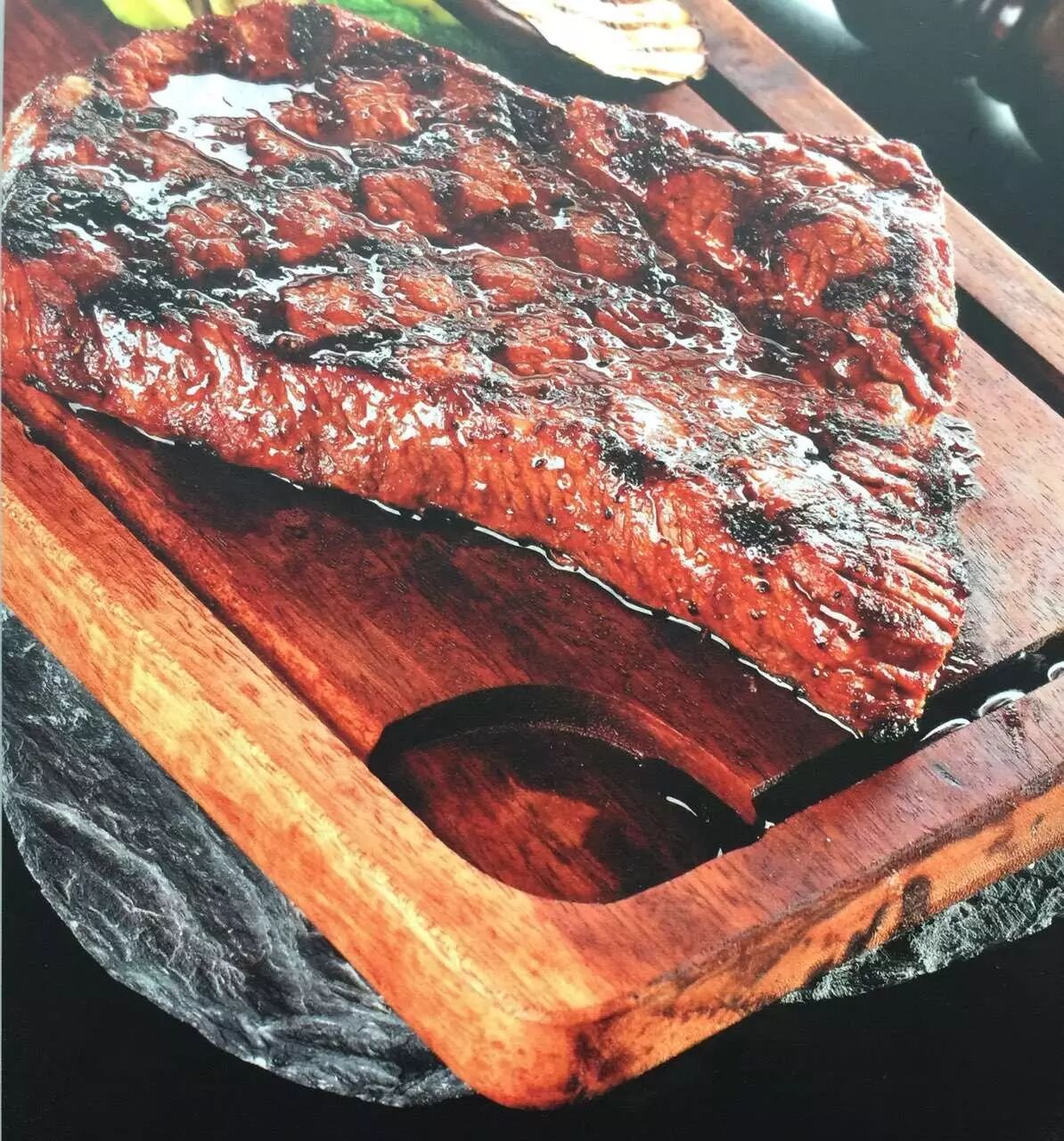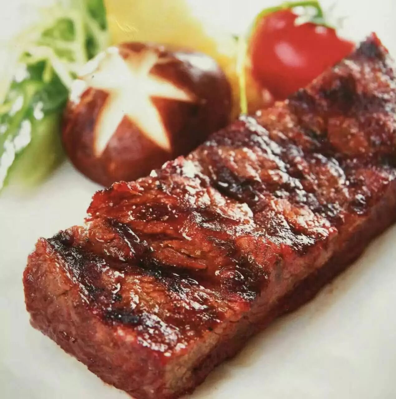 果木烤肋眼王 取自牛的第6根到第12根肋骨附近的肉,特色是多汁、肉嫩、而且有许多脂肪夹杂,吃起来滋味无穷!