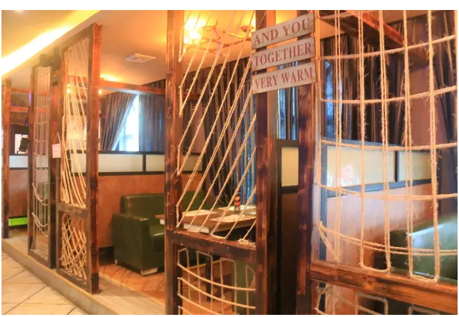 麻绳古木围成的一个个隔间,让整个牛排馆更添一份古朴的韵味。