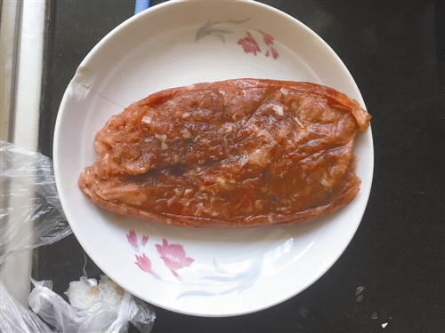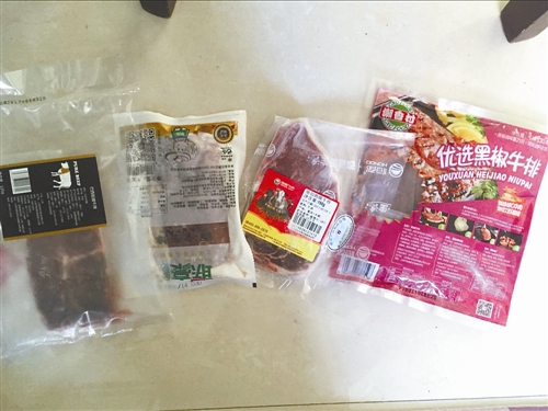 记者从网上购买的原切牛排和拼接牛排,可以从包装和配料表中区分它们。