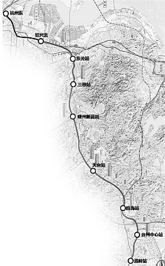 杭绍台铁路从杭州东站出发,到绍兴北站后,设东关站、三界站、嵊州新昌站、天台站、临海站、台州中心站和温岭站,铁路全长269公里,其中新建正线224公里,目标350公里/小时,项目可研估算总投资为448.9亿元。