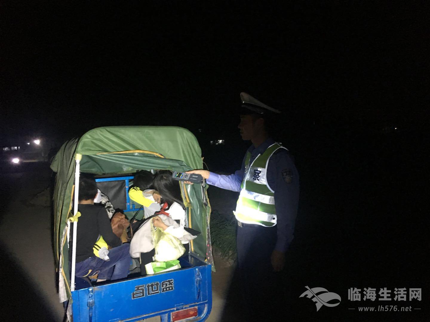 民警方勇掀开篷布一看,车斗里居然挤着5个学生。民警劝导并教育驾驶员驾乘电瓶三轮要戴安全头盔,且不能在车斗里载人。驾驶员始终不吭声,民警对其呼吸式酒精检测,检测仪器上显示21mg\100ml属于酒后驾驶。民警立即将三轮车驾驶员及车上的学生5人带至永丰交警中队。