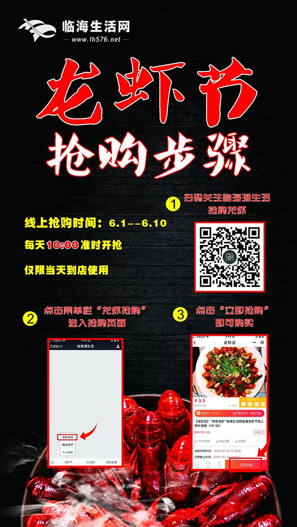 1. 6月1日至6月10日期间,每家龙虾馆每天提供3-5份超低优惠秒杀抢购套餐,低至9.9元一份!每日10:00准时上线,抢购后仅限当天到店使用,数量有限,先抢先得!