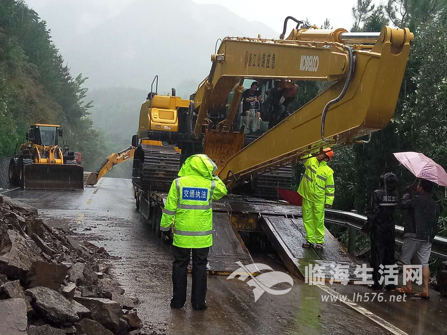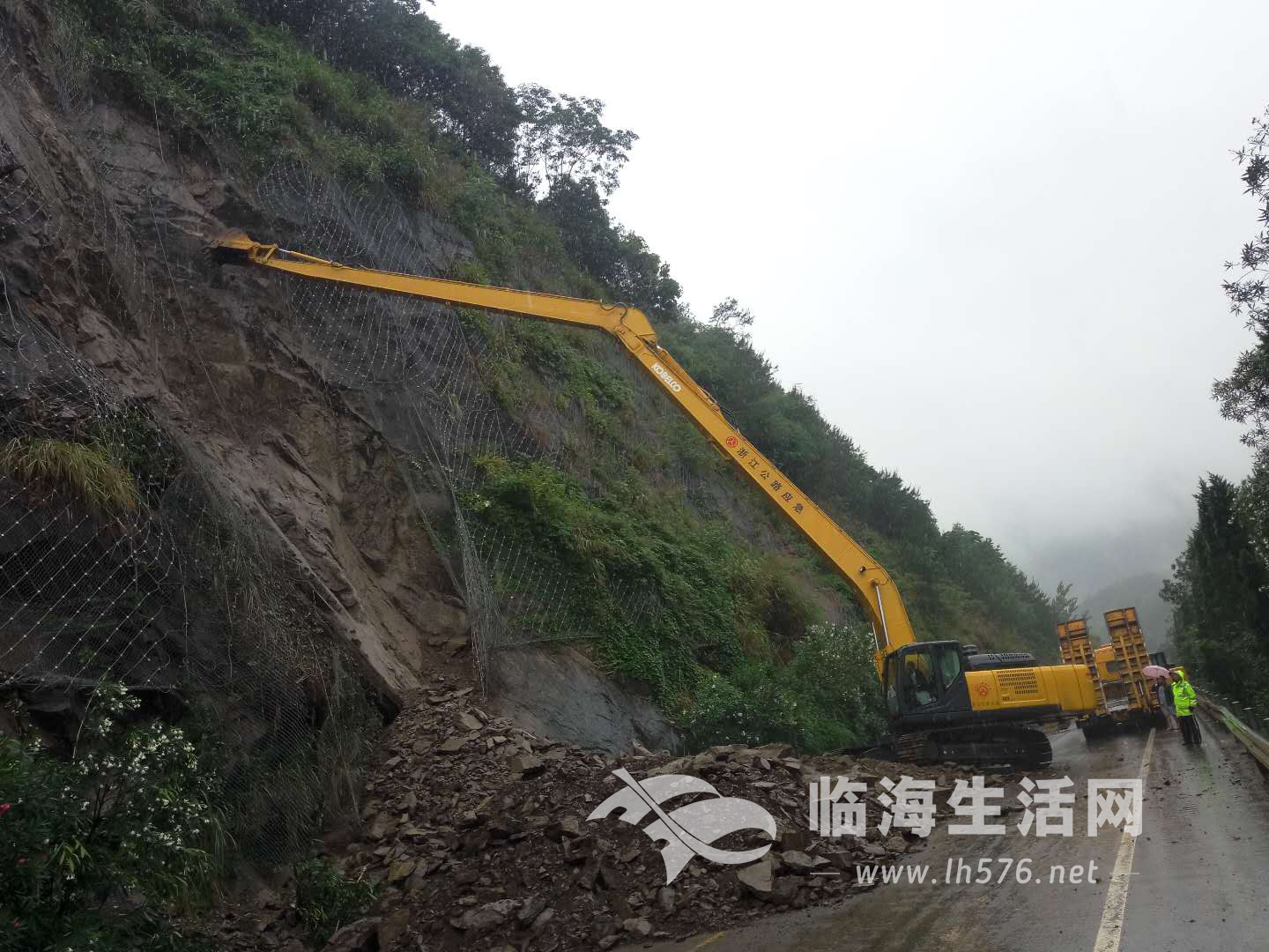 由于山体险情比较复杂,公路局出动装载机、挖掘机各2台,抢险车5辆,参与抢险30多人,工作人员还从椒江调来特殊机械(长臂挖掘机)投入抢险中,截止到13点30分许,长臂挖掘机到达现场进行抢险,待险情排除结束后道路才能恢复正常通行。