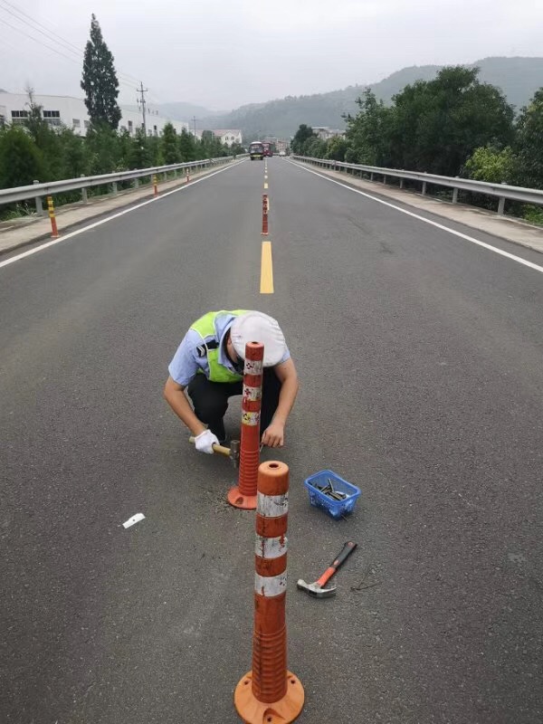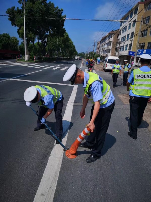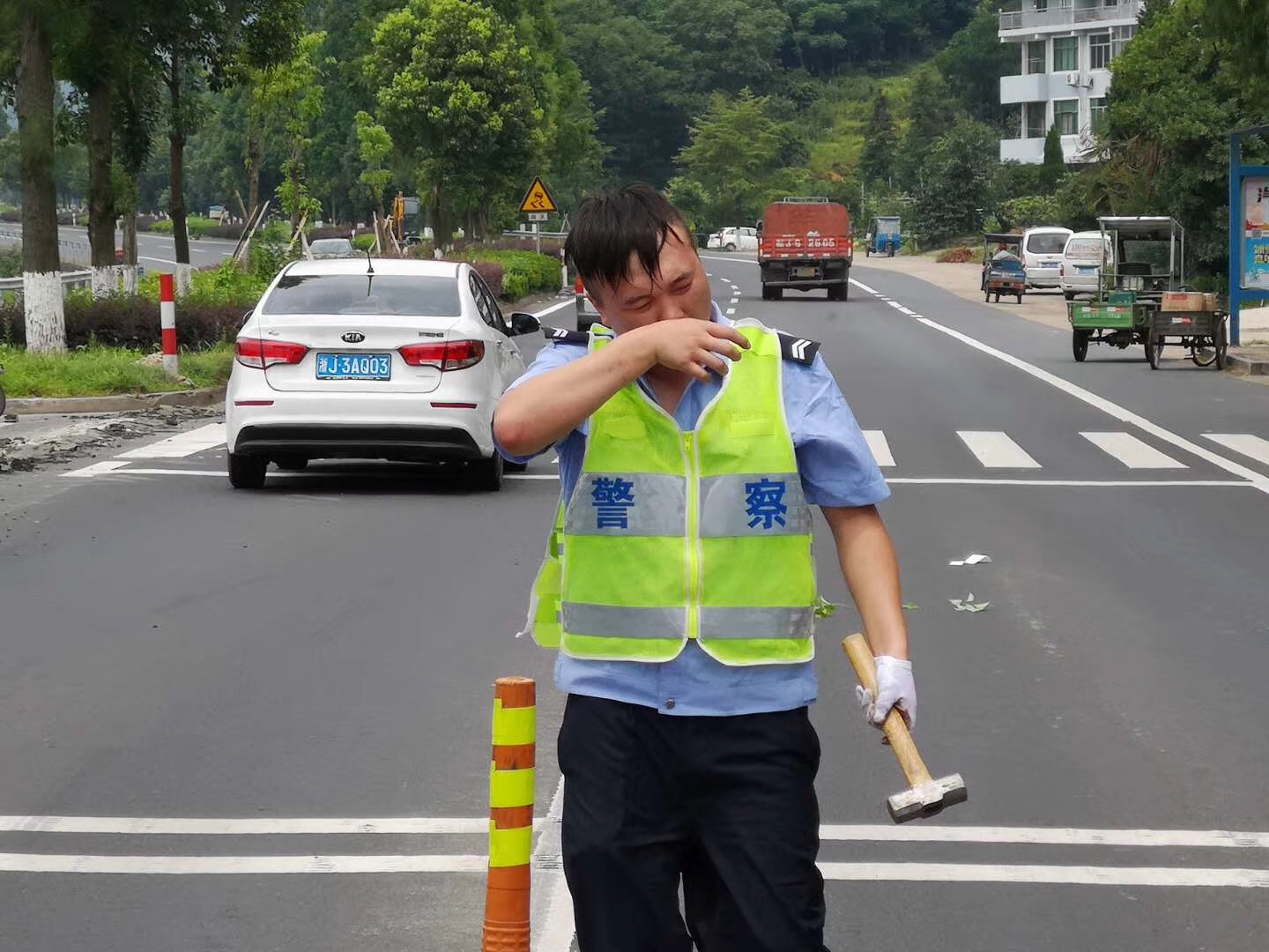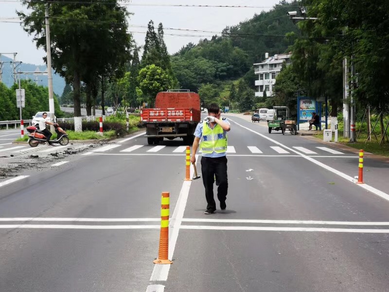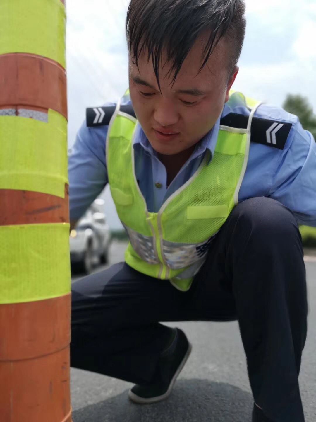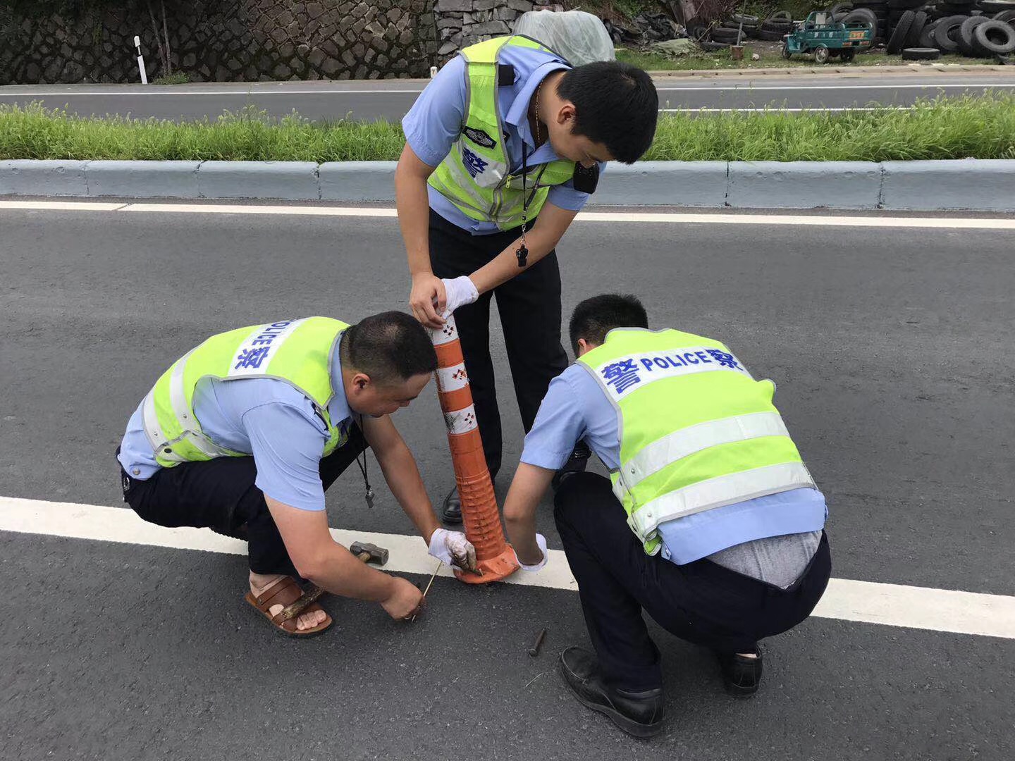 为了市民出行安全,为了让更多的人与交通事故说不,临海永丰交警依然坚守在第一线,他们巡逻在104国道及322省道的辖区道路上,蹲在马路中间,正在紧锣密鼓地挥锤安装、维护弹性警示桩,辖区的104国道及322省道总共71个点位,800根警示桩,时而被大卡车撞断、时而警示桩上的反光漆被刮擦,交警蜀黍们就这样头顶烈日,一路巡逻一路一锤一锤地安装、维护着辖区的警示桩,全身蒸烤,汗如雨下。