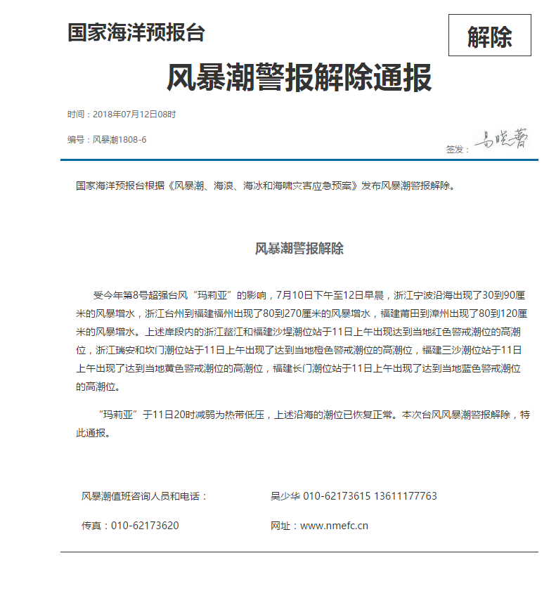 “玛莉亚”于11日20时减弱为热带低压,上述沿海的潮位已恢复正常。本次台风风暴潮警报解除,特此通报。