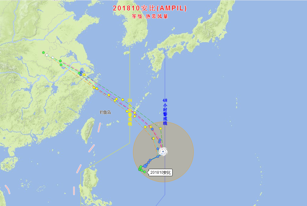 预计,“安比”将以每小时10公里左右的速度向偏北方向移动,20日以后将逐渐转向浙江沿海方向移动,强度逐渐加强,最强可达强热带风暴级或台风级(10~12级,28~35米/秒),21日凌晨进入东海,并将于22日凌晨至上午在浙江沿海登陆(强热带风暴级或台风级,10~12级,28~35米/秒)。登陆后将继续向西北方向移动,强度逐渐减弱。