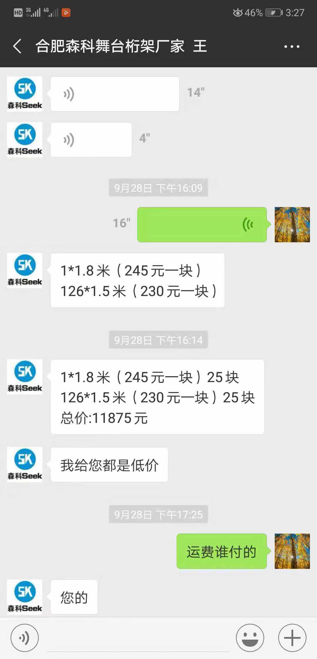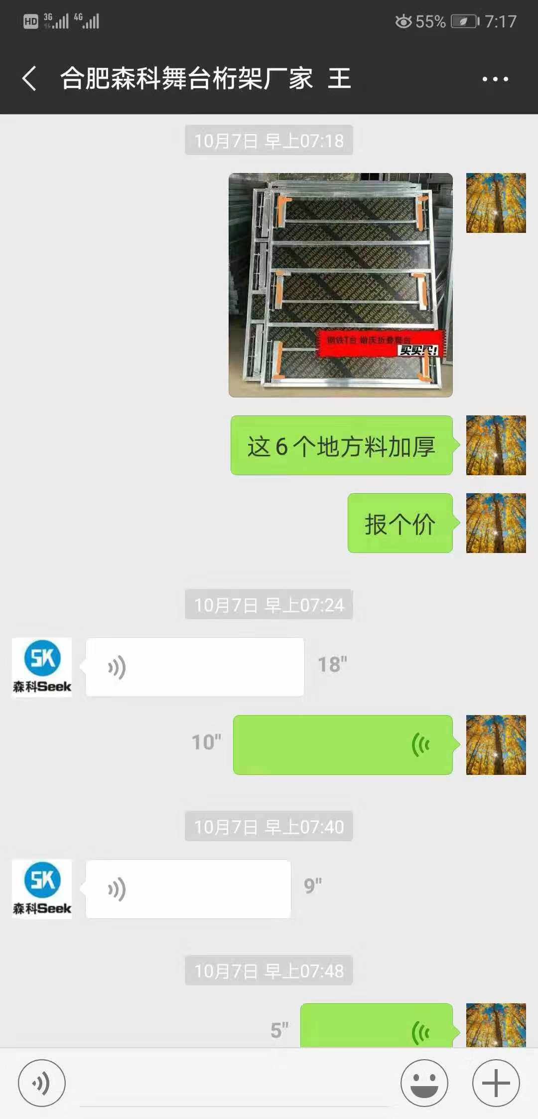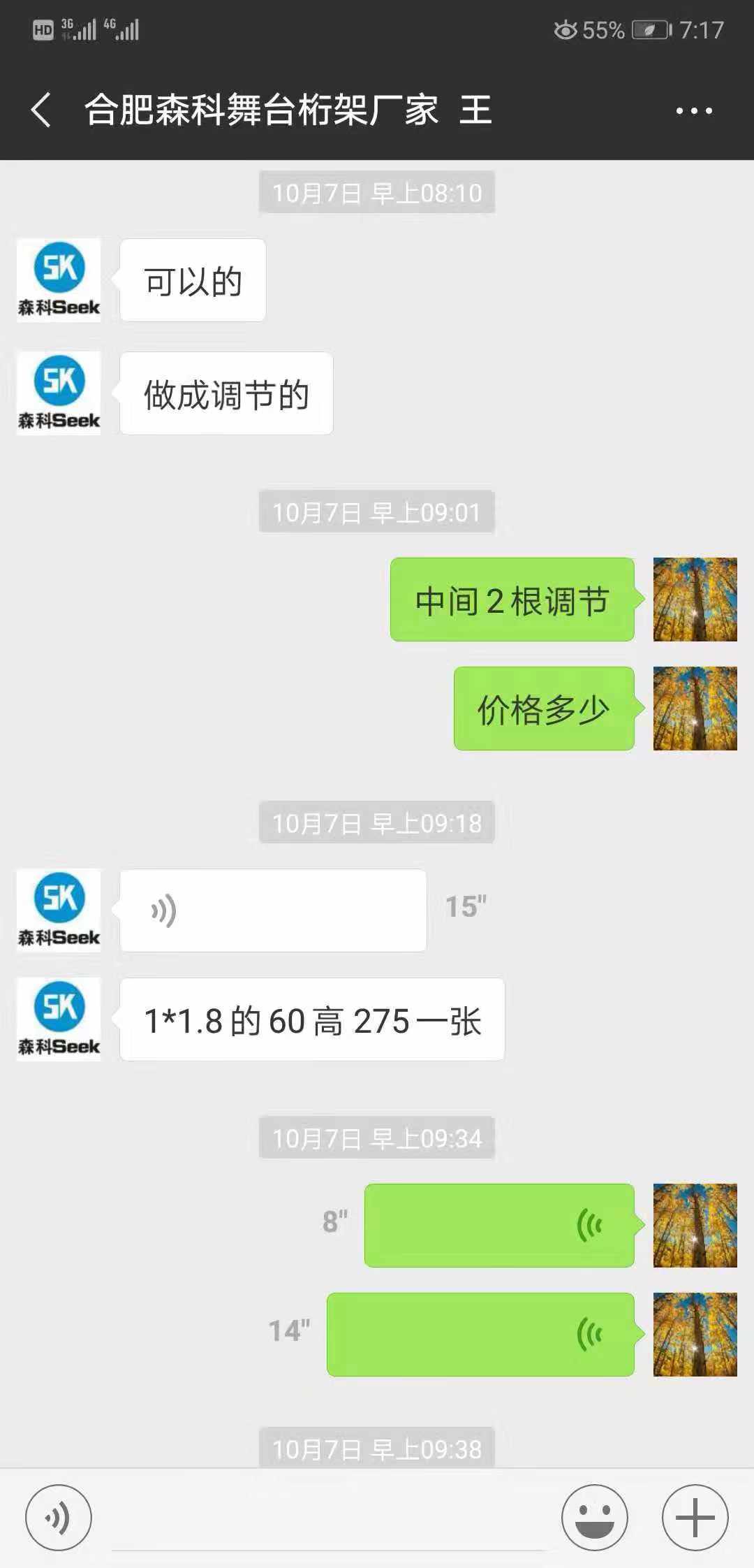 以下为杨先生与”合肥森科金属制品有限公司“厂家方第一位接触的人员的部分聊天记录▼