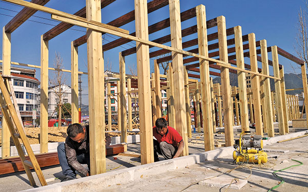 图为公园内文化长廊施工现场。孙海康摄
