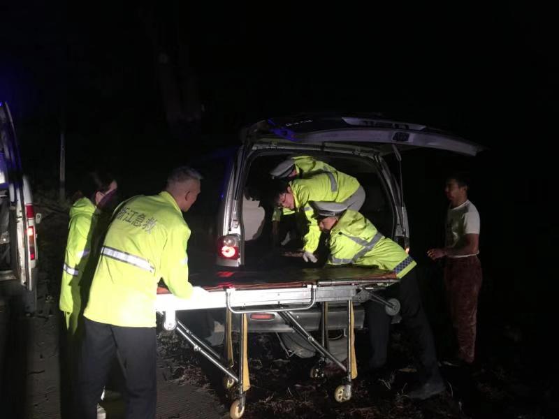 凌晨1点许,临海永丰交警到达现场后立即开展营救,由于巨大的撞击力,四个车门被卡死,朱明从驾驶室内把后备厢打开。20分钟后,120急救车到达现场。民警与医生一起将朱明妻子抬上担架,夫妻双双被送进了医院治疗。