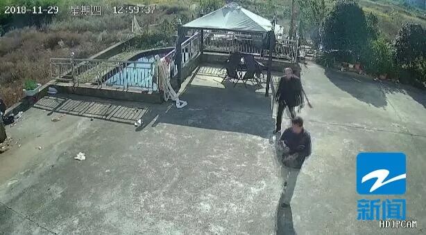 接警后,民警发现蔡师傅家旁边刚好有一个监控。监控显示,当天中午,有两名男子拿着砍刀,先后进入菜园,在里面呆了近一个小时才离去。