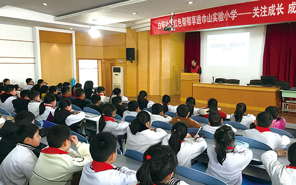 3月12日,巾山实验小学阶梯教室,同学们正在聆听“台州好人”、白塔社区党员志愿者王曰华讲述自己的故事。当天,白塔社区“红色帮帮享”心灵驿站走进巾山实验小学,开展“关注成长 成就未来”主题活动,邀请王曰华向同学们分享好人故事,传递榜样力量。