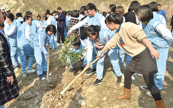 3月12日,大洋中学开展植树节活动,学生们在老师的带领下,手持铁锹和水桶,在校园中种下一棵棵金橘苗、枣树苗、桃树苗,为校园增添一份绿。