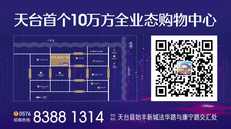 天台祥生世纪广场是天台首个集时尚购物、休闲娱乐、生活配套、美食餐饮、儿童游乐等于一体的10万方超大综合体,地上4层地下2层,总计约800个停车位。目前已成功签约大地影院、世纪联华、杰仕健身、奇星乐儿童游乐、苹果、华为、小米、ME&CITY、大渝火锅、蛙喔、鲜芋仙等优质品牌。