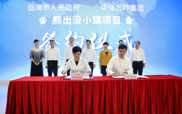 在与会领导共同见证下,市委副书记、市长王丹代表临海市人民政府与华强方特文化科技集团有限公司总裁刘道强签署了“熊出没”小镇项目合作协议。