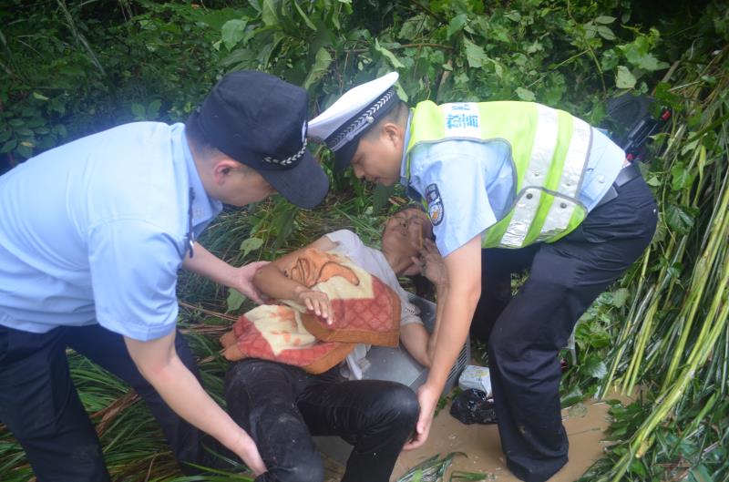 民警来不急拖下鞋子,直接趟水过河,将驾驶员的妻子往溪边上移到,由于受伤者腰部受伤比较严重,在水边不能移到。永丰中队中队长在溪水中半蹲着用自己的手托举着受伤的头部近半个小时。