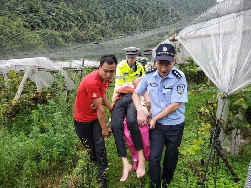 河头派出所的同志及附近村民在葡萄园里找来了躺椅、竹干、绳子等救援工具,警民一起将竹制躺椅改造成简易担架,警民接力将伤者抬出了2公里外的马路上。