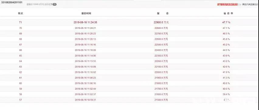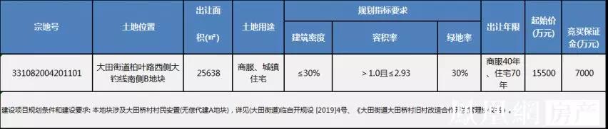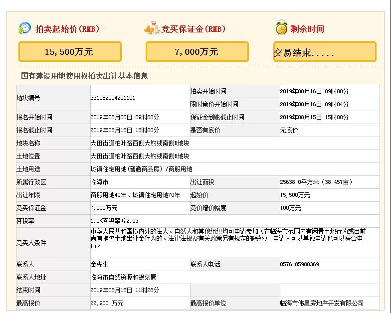 8月16日,临海市大田街道柏叶路西侧大钓线南侧B商服住宅用地(331082004201101)成功出让。经过71轮竞价,由伟星以22900万元竞得,成交楼面价3048元/平(未考虑无偿代建、配建等因素),溢价率47.7%。
