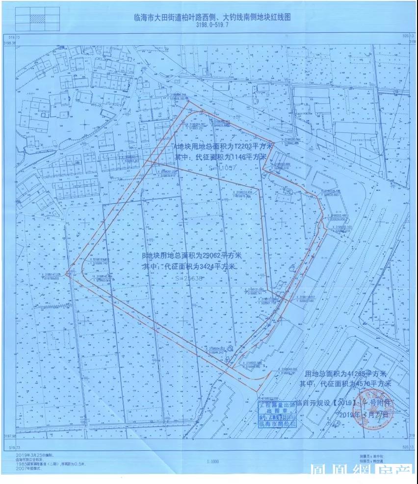 柏叶东路与大钓线转角地块位于柏叶东路以北、大钓线以西,依据(大田街道)临自开规设[2019]4号规划设计条件,规划可建设总用地面积36695㎡(其中A地块使用权人为甲方,为村民安置用地,用地面积11057㎡;B地块为出让开发用地,用地面积25638㎡),地块地上建筑面积≤103425.26㎡,其中A地块村民安置地上建筑面积≤28305.92㎡、B地块出让开发用地地上建筑面积≤75119.34㎡。具体见临海市大田街道柏叶路西侧、大钓线南侧地块红线图及经临海市住房和城乡建设规划局评审通过的临海市大田街道大田桥区块城中村改造项目总平面图。