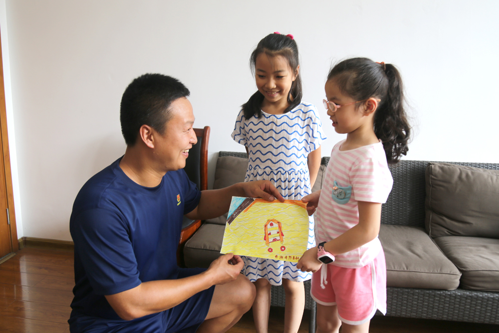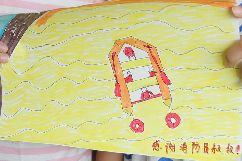 一进门,活泼可爱的小女孩就跑到临海消防救援大队古城中队指导员章津铭面前,把一幅画送给了他。画上画的是消防员驾着皮划艇到她家救援的情景。小女孩说这幅画的名字叫《希望之舟》。“看到了消防员叔叔,我们就看到了希望。我不害怕,因为有消防员叔叔。”小女孩说道。