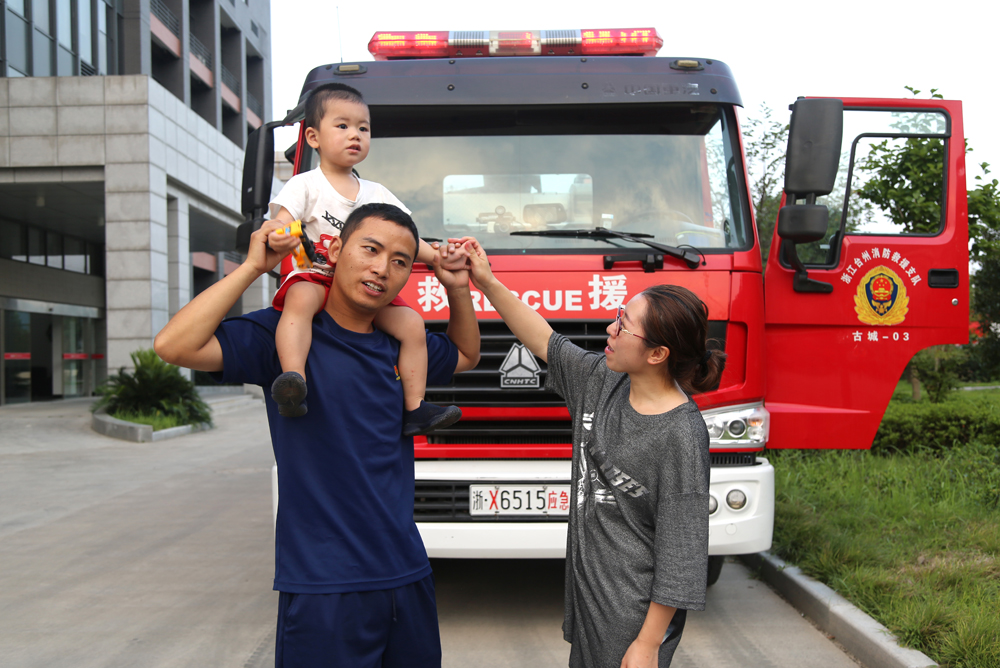 8月20日,临海市消防救援大队内,从冲水清淤现场归队的王焕勇刚下消防车,就听到了一声熟悉的呼唤。他回头一看,只见妻子抱着孩子,孩子招着小手正喊爸爸。他顾不上满身泥污,一把接过孩子,高高举过了头顶。