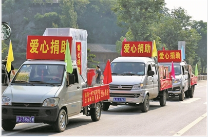 图为一辆辆货车满载着灾后重建物资,前往古城街道敬老院,为老人们解决燃眉之急。 王青军 摄