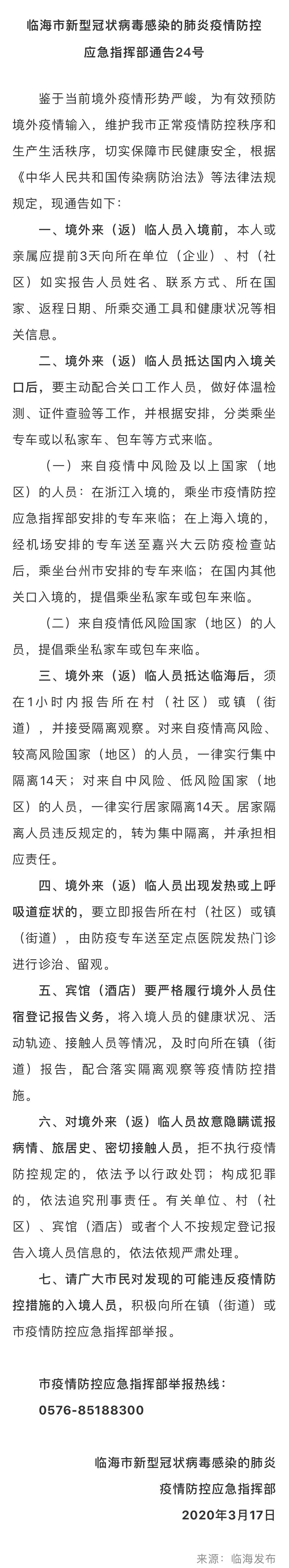 【临海市关于加强境外来(返)临人员管理的通告】
