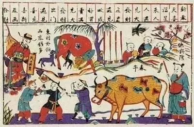 把二开红纸或黄纸印上全年农历节气,印上农夫耕田图样,名曰“春牛图”。