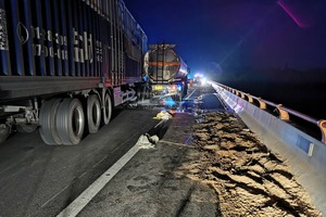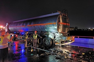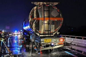 9月20日晚22时55分许,在甬台温高速上沙溪桥附近路段,发生一起车辆追尾事故。一辆装载着33吨乙二醇的槽罐车被追尾,大量乙二醇发生泄漏。接到报警后,临海市消防救援大队立即调派江南消防救援站、大田消防救援站的消防指战员火速前往现场施救。