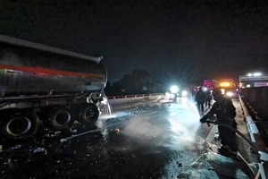 当指战员到达现场时,高速救援人员已对事故现场实施了警戒。只见事故现场,一辆物流厢式大货车撞上了事故槽罐车,巨大的冲击力使槽罐车罐体尾部发生破裂,大量乙二醇正倾泄而出。由于罐体破裂严重,漏点无法堵住,消防救援人员立即利用水枪对泄漏的乙二醇进行稀释。随后,高速救援人员调来了木屑,对泄漏的乙二醇进行了吸附处理后运下高速。至凌晨2时左右,险情被完全排除。