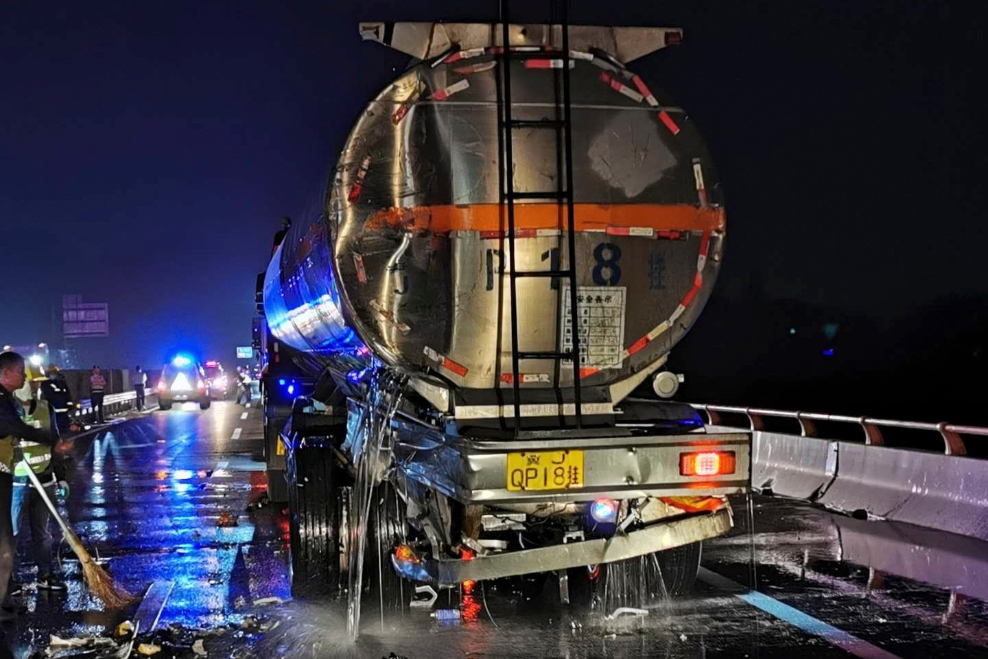 据槽罐车驾驶员称,当时前方发生了事故,他将车子停下来的时候,后方车辆撞了上来,导致了事故的发生。