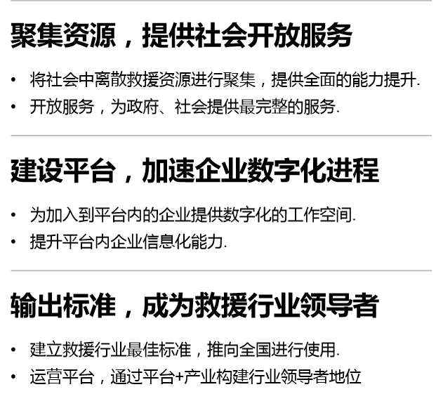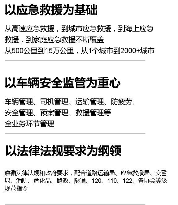 公司主要市场定位:为道路运输行业提供平台服务,通过互联网技术建设安全、专业和高效的高速公路及城市救援体系,配合实现政府在公路运输及危险货物运输的车辆监管、指挥与调度的落地功能。