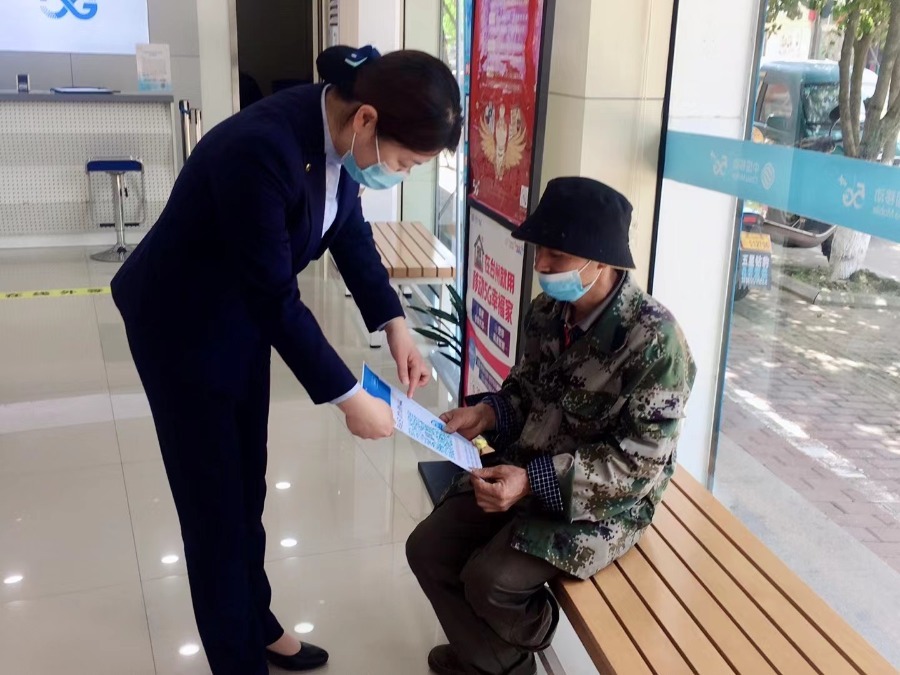 陈薇让老人拿出手机,一看原来是老年机,告知可以在我们营业厅买台智能机,然后再帮他领取下健康码。老人没有说话,拿着手机走到营业厅的休息区坐了下来。