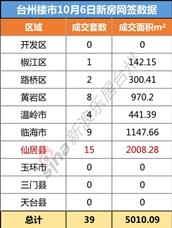 截止到当日22:00,台州市共网签新房39套(包含商铺、地下室、安置返还等),网签面积5010.09平方米。显示的数据中,仙居县去化15套新房,居各县市区之首。