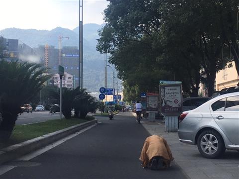 2017年7月6日下午3时左右,我在临海市区靖江中路原东方百货处偶遇一名僧人朝拜,一路叩首,嘴中念念有词,以自身丈量每一寸土地。路边行人纷纷回头观看。