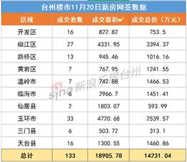 (新浪乐居台州讯)11月20日台州市共网签新建商品房(含住宅、商贸、写字楼、其他)133套,网签面积18905.78平方米,台州楼市新房成交总价共14231.0