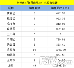 5月4日台州房产交易数据:截止到当日23:+商贸写字楼)签约量49套,签约面积平方米。 其中温岭市销售19套,居各县市区签约数量之首;签约面积