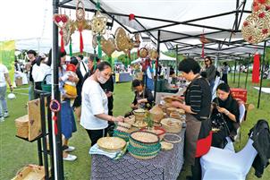 图为在复古摩登集市的非遗区,小芝传统草编技艺吸引了众多市民参观。李欣摄 复古摩登集市、风铃艺术小食汇、汉服巡演……今年“五一”小长假,灵湖景区推出的