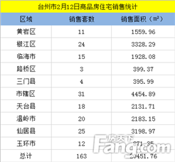 2月12日台州房产交易数据:截止到当日23:+商贸写字楼)签约量163套,签约面积平方米。 其中市辖区销售31套,居各县市区签约数量之首;签约面积4