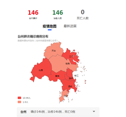 2020年3月16日0-24时,台州市无新增新型冠状病毒肺炎确诊病例。 截至3月16日24时,台州市累计报告新型冠状病毒肺炎确诊病例146例,累计