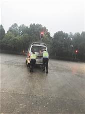 暴雨倾盆,红绿灯路口排队的车子双跳灯闪烁,两名交警在暴雨中推着一辆面包车吃力地往前一步步挪动——昨日,这张照片在临海小伙伴的朋友圈转发,让不少市民为之感动。记者