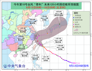 根据市气象台9月12日19时发布的台风警报显示,今年第18号台风“泰利”12日17时中心位于距离台州东南方向约980公里的西北太平洋洋面上,中心附近最大风力13