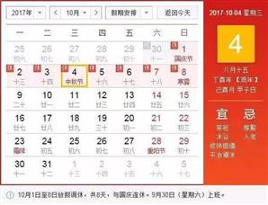 根据国务院办公厅通知精神,2017年中秋节、国庆节放假安排如下: 10月1日(星期日)至10月8日(星期日)放假调休,共8天。9月30日(星期六)上