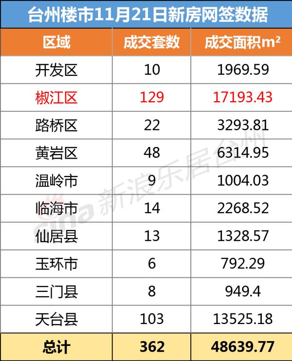 截止到当日22:00,台州市共网签新房362套(包含商铺、地下室、安置返还等),网签面积48639.77平方米。显示的数据中,椒江区去化129套新房,居各县市区