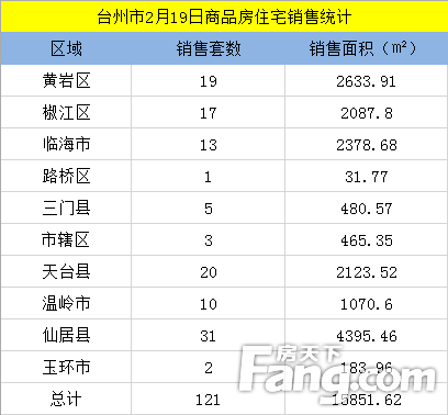 2月19日台州房产交易数据:截止到当日23:+商贸写字楼)签约量121套,签约面积平方米。其中仙居县销售31套,居各县市区签约数量之首;签约面积4395.46平