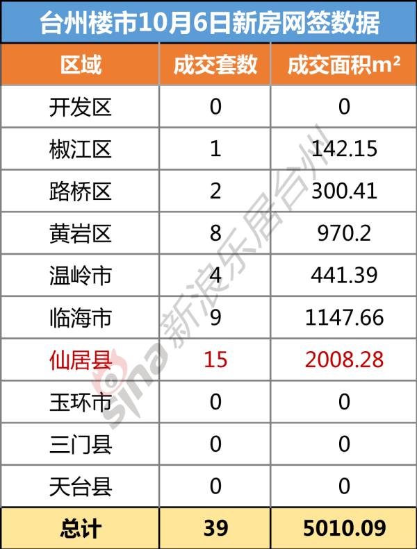 截止到当日22:00,台州市共网签新房39套(包含商铺、地下室、安置返还等),网签面积5010.09平方米。显示的数据中,仙居县去化15套新房,居各县市区之首。