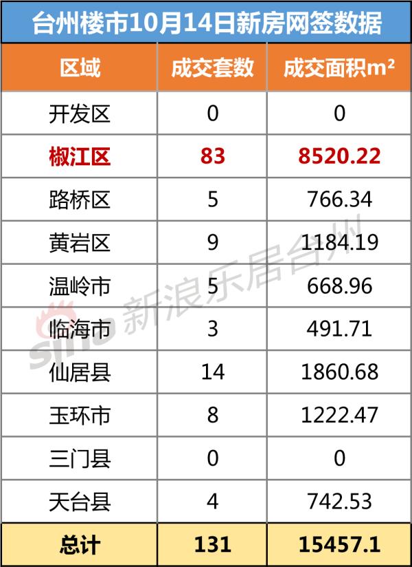 截止到当日22:00,台州市共网签新房131套(包含商铺、地下室、安置返还等),网签面积15457.1平方米。显示的数据中,椒江区去化83套新房,居各县市区之首